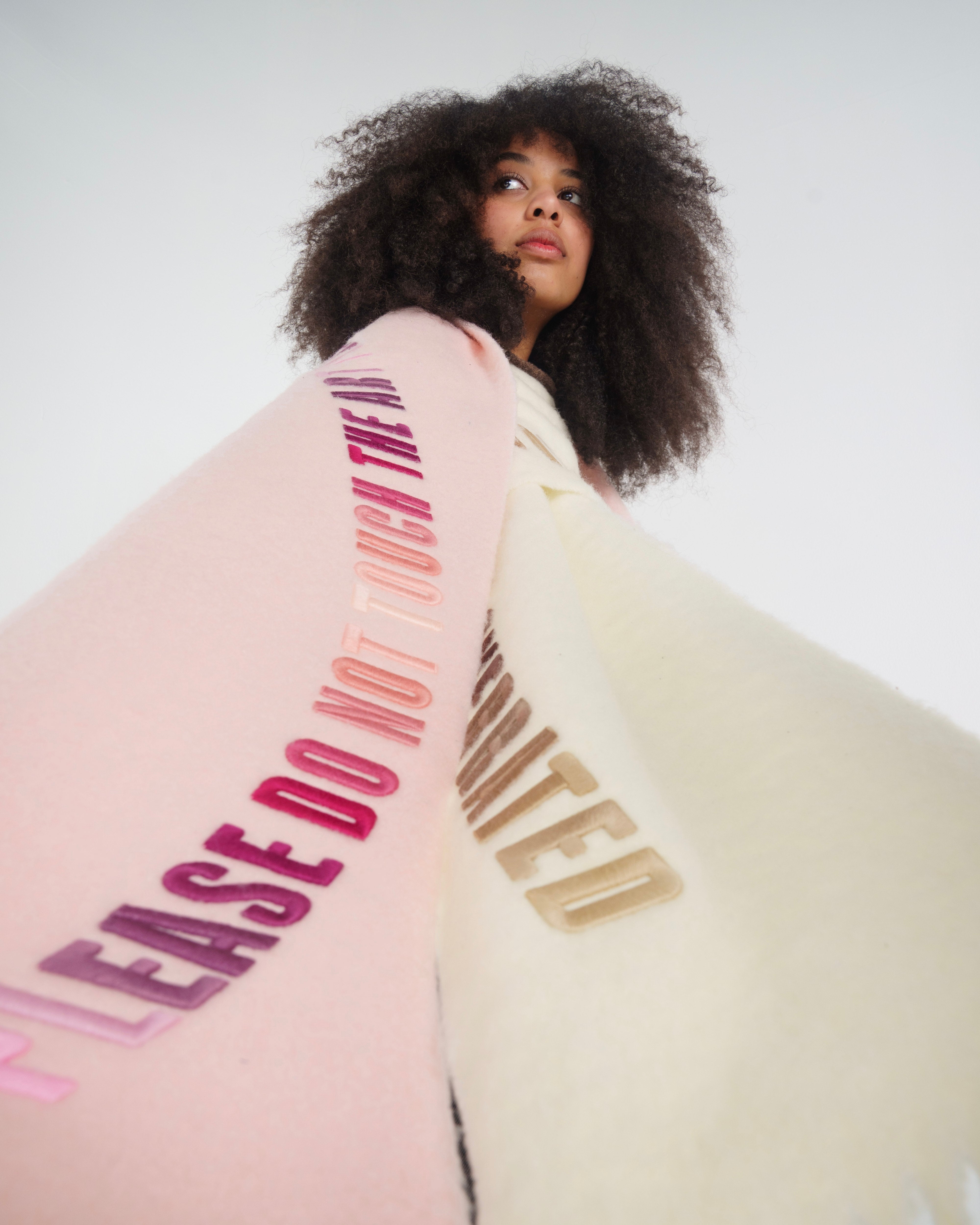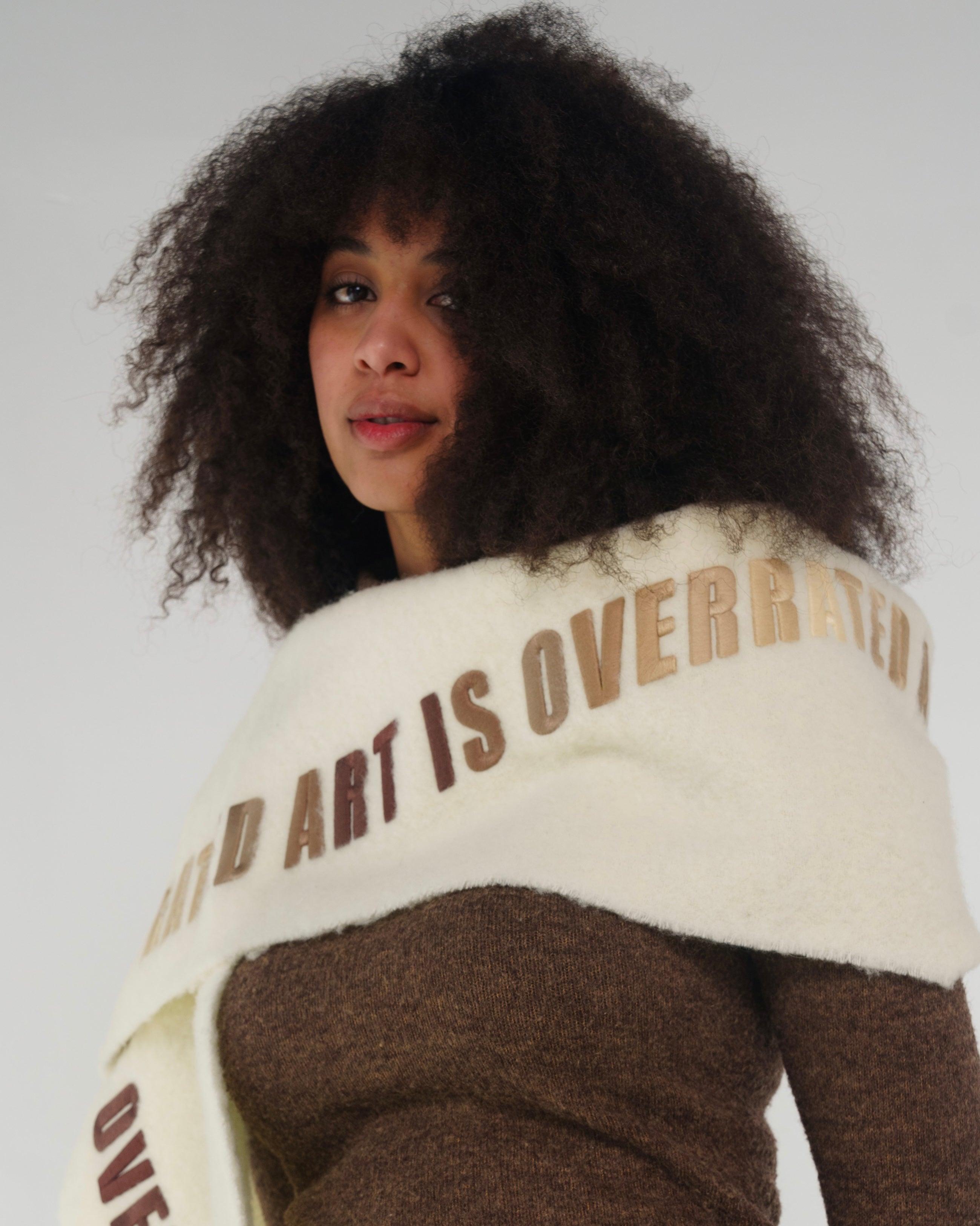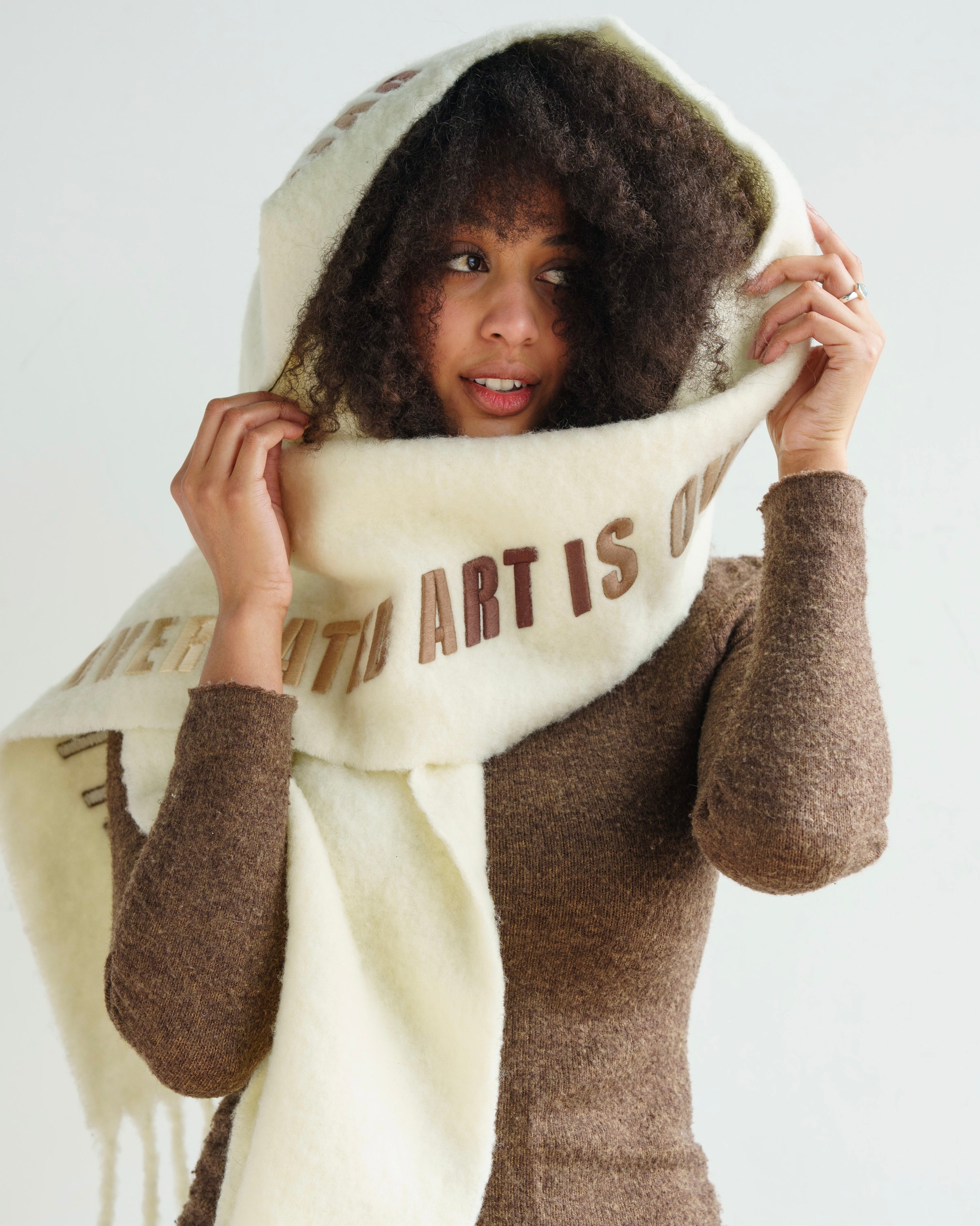 Scarf No.1 features the phrase, "Art Is Overrated" in a neutral, brown-toned embroidered gradient.